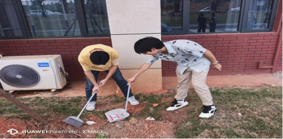 我院学子积极开展校园清洁活动。在校园的草坪与步道旁,两名同学分工协作,一人手持簸箕,一人俯身拾捡垃圾,认真清理每一处杂物。他们以实际行动践行环保理念,为打造干净、舒适的校园学习生活环境贡献力量,展现了当代学子的责任与担当。