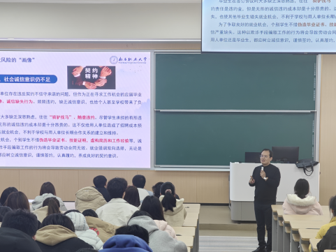 副校长杨晓培教授结合数智学院专业特色与人才培养目标,为同学们系统讲解就业风险防控与法律维权知识,指导大家警惕求职陷阱、规范签订就业协议,守住个人劳动合法权益。同时针对同学们在就业择业、权益保障、升学就业权衡、职场法律风险等方面的常见困惑逐一解答,引导大家树立法治为先、理性务实的就业观,在求职路上规避风险、找准合规发展方向,平稳实现高质量就业。