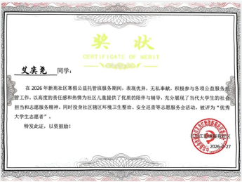 艾奕尧用六十天时间参与多项志愿服务:清理社区楼道“牛皮癣”,参与禁燃禁放巡查,守护社区环境与安全;在团中央直属的公益托管班,他陪伴孩子学习、开展趣味课程,为老人送腊八粥、为居民写春联;春运期间,面对火车站电梯故障,他主动扛起行李,疏导旅客,用汗水铺就归乡坦途。他的坚守诠释了志愿精神的深刻内涵。