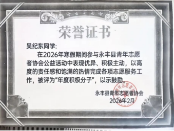 吴纪东主动积极参与春运志愿服务,在客车站引导旅客、解答疑问、搬运行李,用细致贴心的服务为出行高峰期的旅客排忧解难。他还联合同学组建学习小组,开展社区小学生公益助学活动,为孩子们辅导功课、教授画画折纸,丰富课余生活,点燃求知热情。他用双重奉献传递温暖,彰显青年担当。