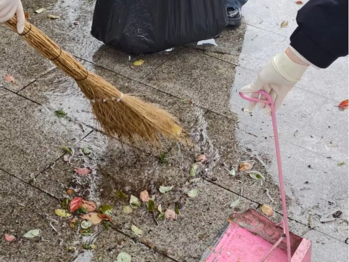 抵达目的地后,志愿者们沿着潦河北岸的步道、草坪、栏杆及周边街巷,开展全方位、拉网式的清洁行动。雨丝打湿了发丝与衣衫,却丝毫浇不灭大家的热情,有人俯身捡拾岸边草丛与缝隙中的塑料瓶、包装袋,有人细致清理栏杆缝隙里的顽固杂物,有人手持扫帚清扫步道上的潮湿落叶与花瓣,还有人互相协作传递工具、分装垃圾。整个过程分工有序、配合默契,每一处卫生死角都被认真清理,用双手为河“洗去尘埃”。